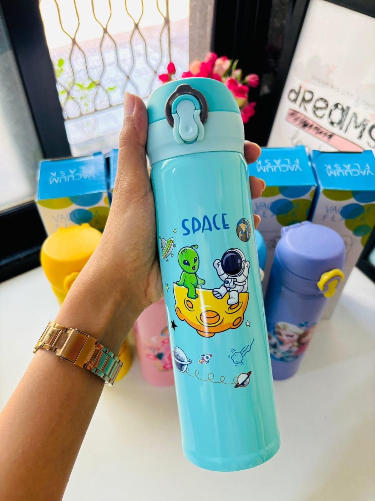 Keep your drinks hot or cold in style with this space Theme Vacuum Flask Bottle! ๐ Made from high-quality food-grade metal, itโs safe, durable, and perfect for kids. With a 500ml capacity, this cute bottle is both practical and magical for everyday use